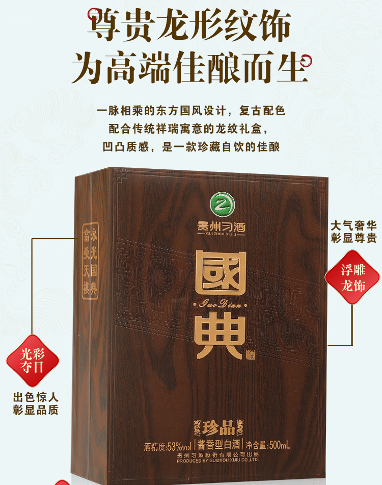 53度酱香型白酒,⁣百年传承非遗酿造技艺 入口绵柔、‏不辣喉,空杯留香持久 东方国风设计,复古配色配合传统祥瑞寓意的龙纹礼盒,送礼更大气