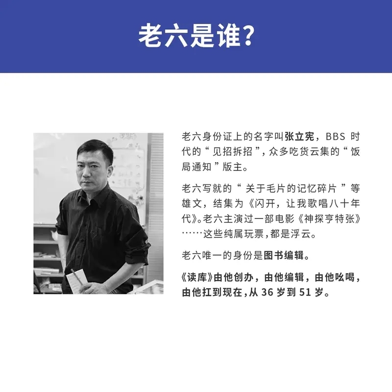 此外,让《读库》成为中国杂志书高品质标杆的,还靠一个人,那便是主编张立宪,江湖人称“老六”。