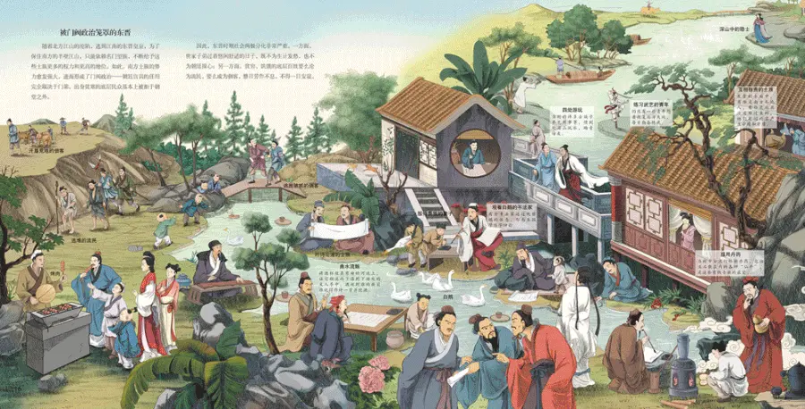 书中每个朝代,还都用一幅宏大且细腻的全景插画,展现出每个时期的真实场景,跟看“清明上河图”似的。