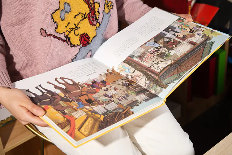 64幅宏大细腻、惊艳震撼的全景插画,一把就抓住孩子的眼球,让他们一下子穿越到那个朝代,跟看动画片似的,沉浸其中、不可自拔。